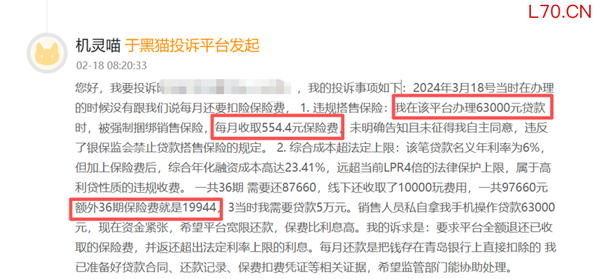 黑猫投诉 【下载黑猫投诉客户端】平台上“贷款捆绑保险”相关投诉量已超过7000条,投诉对象包括银行、保险公司、消费金融公司、小贷公司等。