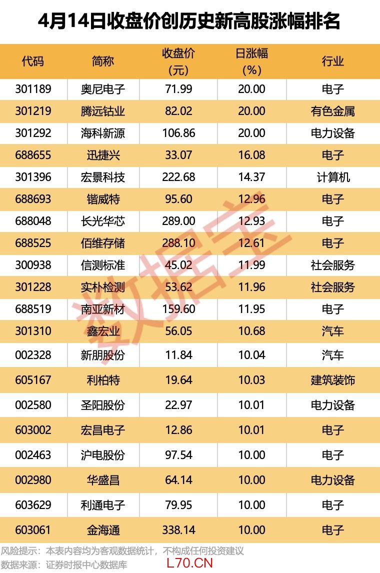 收盘价创历史新高股中,今日股价平均上涨6.8%,涨停的有奥尼电子、腾远钴业、海科新源等,涨幅居前的有迅捷兴、宏景科技、锴威特等。