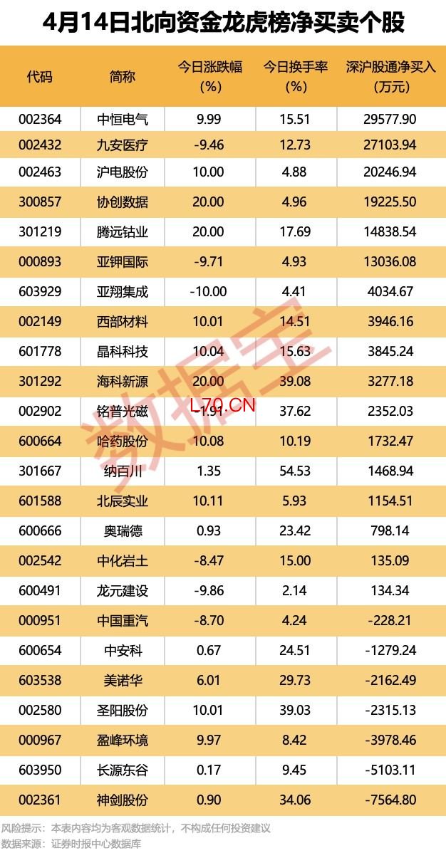 今日龙虎榜现身个股中,17股获北向资金净买入,其中6股净买入金额均超1亿元。中恒电气、九安医疗、沪电股份获净买入均超2亿元;协创数据、腾远钴业、亚钾国际获北向资金净买入均超1亿元。