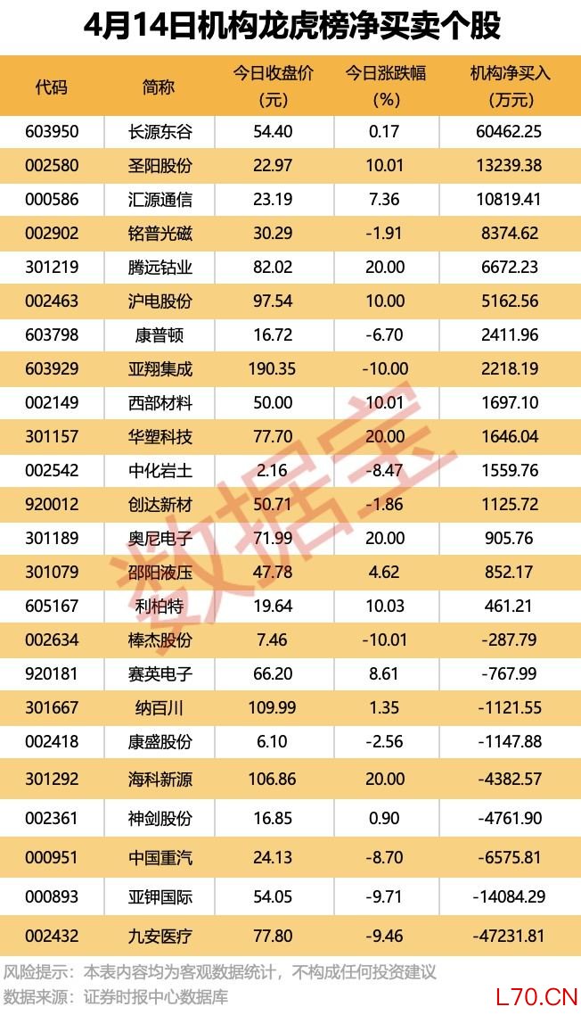 今日龙虎榜中,净买入个股为15只,净卖出的个股为9只。12股净买入金额均超千万元,长源东谷获机构净买入6.05亿元,居首。圣阳股份和汇源通信机构净买入金额均超1亿元。