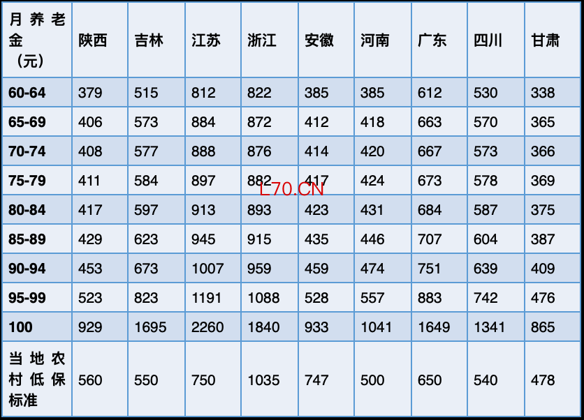 将这一补偿额纳入养老金后,2025年各地农村老年群体的月养老金水平显著提升(表3),江苏各年龄组月养老金均超过当地农村低保标准,广东、四川、吉林等省份也基本实现养老金充足,能覆盖低保标准;而陕西、安徽、河南、甘肃等中西部省份,虽养老金与低保水平的差距大幅缩小,但仍难以完全满足基本生活需求,目前这几个省份财政补贴水平较低,进一步提升到低保标准是有空间的。