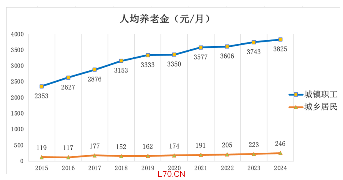 我国城乡居民养老保险已实现制度全覆盖,参保人数在2024年底已达5.38亿人,主要参保人群为农村居民。然而,居民养老保险待遇水平偏低,与城镇职工基本养老保险待遇存在巨大鸿沟。近年来,职工养老保险平均待遇约为居民养老保险的15.5倍官方配资入口,2020到2024年,全国城镇退休职工人均养老金从每月3350元增长到每月3825元,而城乡居民人均养老金同期从每月174元增加到每月246元,长期处于低位。