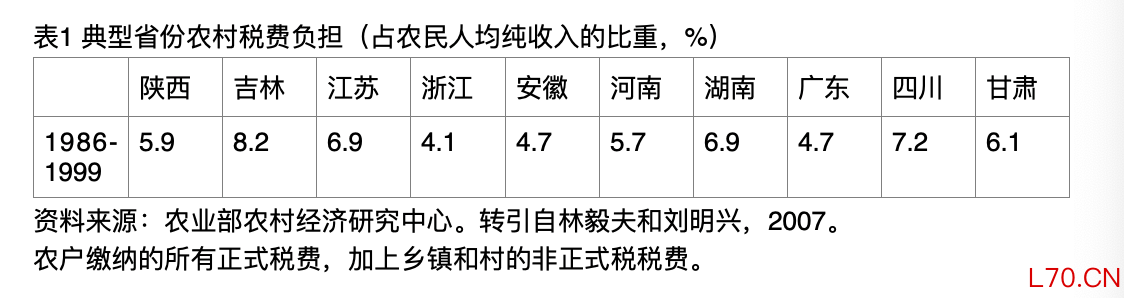 在显性层面,农民长期承担着农业税、村提留、乡统筹等法定税费。1980年代初家庭联产承包责任制推行后,农村税费制度逐步形成,1991年《农民承担费用和劳务管理条例》确立“三提五统”制度,农民承担着法定与非法定的双重负担;2000年农村税费改革试点启动,取消乡统筹、劳动积累工等,2006年农业税全面取消,乡村公共服务资金改由财政转移支付保障。从10个包含了东中西地区的典型省份数据来看,1986-1999年,陕西、吉林、四川等省份农民总负担率在某些年份最高达9.5%,即便是浙江、广东等经济较发达省份,也存在不同程度的税费负担。