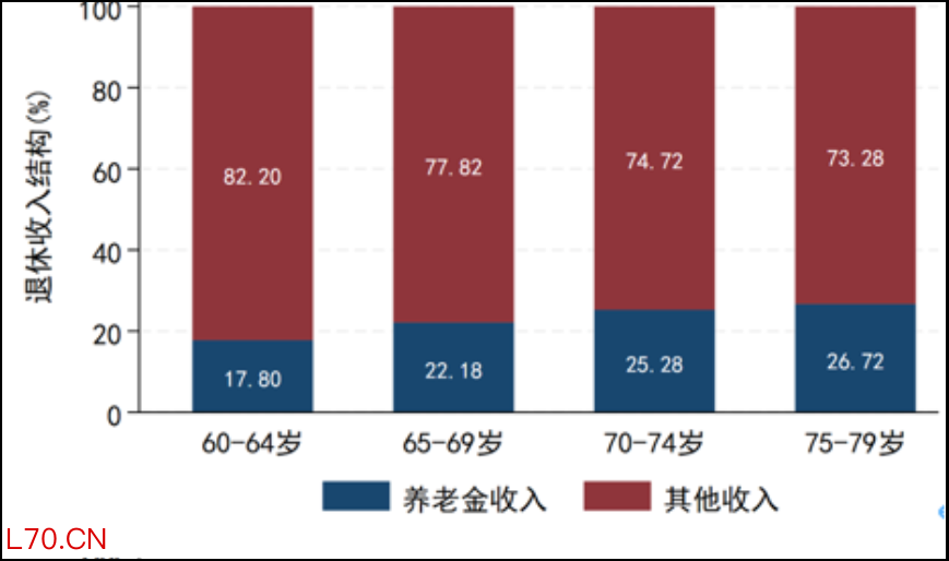 公共养老保险的作用在于为老年生活提供基本保障,但这一点在农村老年群体生活现状中却未能体现。我们采用中国家庭金融调查(CHFS)这一覆盖全国大部分省份的样本,对2021年4646个户主在60岁及以上农村老年家庭进行分析,结果发现,农村老年家庭收入中的养老金收入占比极低,而且户主越老的家庭占比越低。60-64岁群体养老金收入占比26.72%,75-79岁群体更是降至17.80%,其余收入均依赖转移性收入、农业收入等。