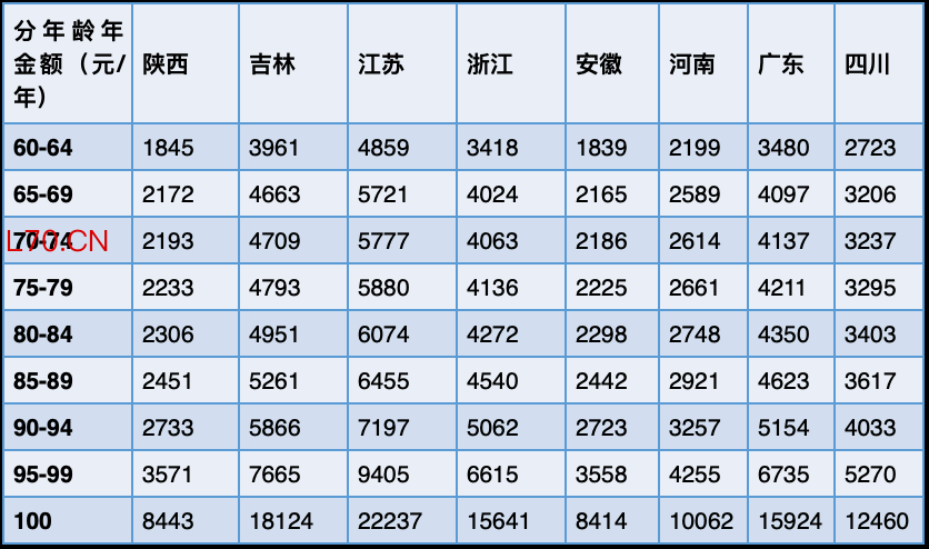 测算结果表明,2025年视同缴费获得的积累折算为年金额,呈现出两个特征(表2),一是年龄越大,补偿越多,因其预期剩余寿命较短,如陕西85-89岁老人年补偿额为2451元,高于60-64岁群体的1845元,但低于100岁以上群体的8443元;二是地区差异显著,这与历史税费负担、农村人均纯收入相关,江苏、浙江、广东等省份补偿额高于中西部省份。