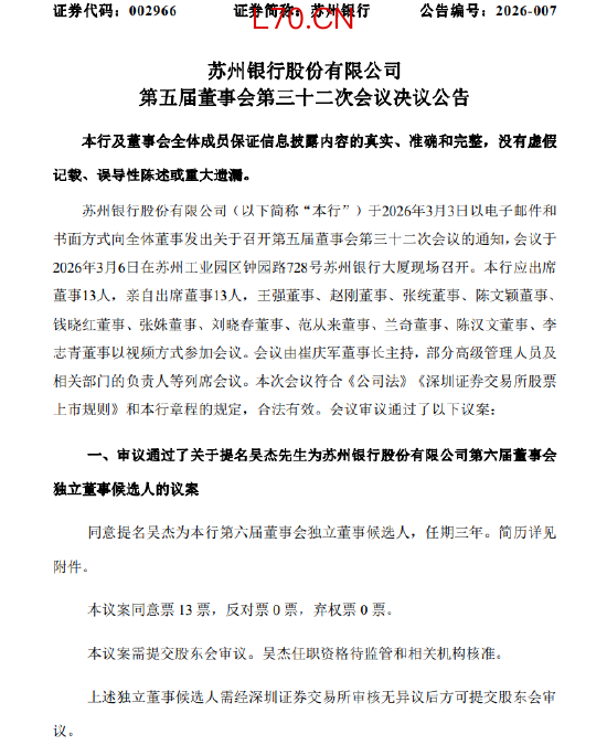 苏州银行:提名吴杰为第六届董事会独立董事候选人