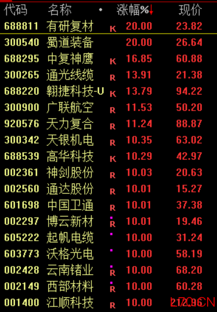 商业航天概念股集体走强,中国卫星、中国卫通、神剑股份等近20股涨停。