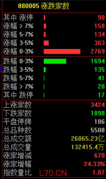 市场共3424只个股上涨,90只个股涨停,1898只个股下跌。