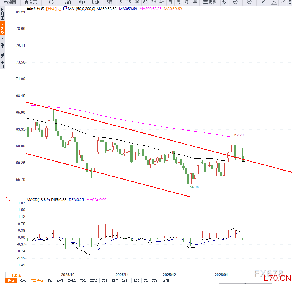 从技术面来看,美原油(WTI)日线走势仍显示出震荡偏弱的特征。价格运行在中期下降通道内,前期反弹多次在关键均线及前高附近受阻,显示上方抛压依然存在。