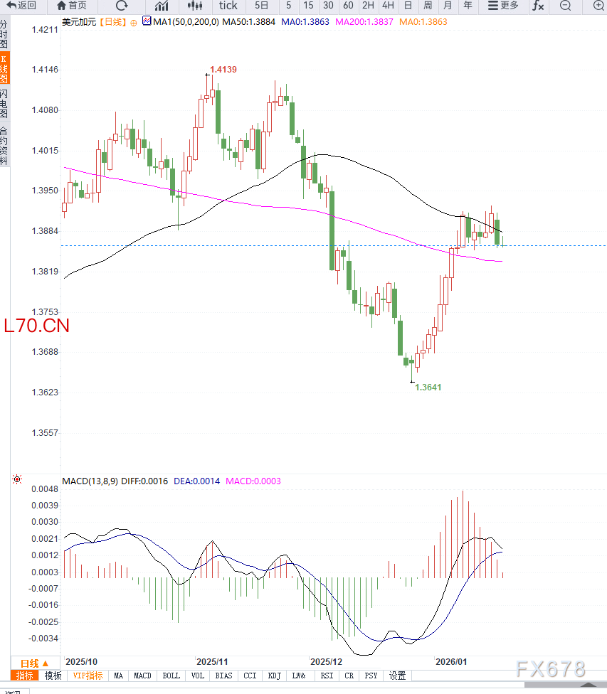从日线结构来看,USD/CAD整体处于震荡偏强格局。价格在1.3800上方多次获得支撑,短期均线系统呈现粘合向上迹象,显示多头略占优势。但1.3900—1.3920区域压力依旧明显,汇价多次上探未能有效突破。