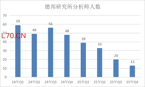 进入2026年,再有分析师人数跌至个位数,那就是24年还有近60名分析师的德邦证券,24年Q3一度大肆招聘,但是此后分析师快速减少,到了25年Q4只剩下13人,分析师人员流失严重。