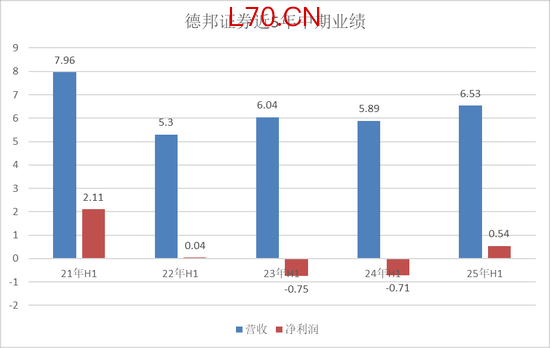 根据wind数据,德邦证券中期业绩波动较大,21年上半年实现了近8亿营收,利润高达2.11亿,此后多年德邦一直处于亏损状态或盈利边缘挣扎,营收也增长低迷。25年中期,该公司营收为6.53亿,利润终于转正。